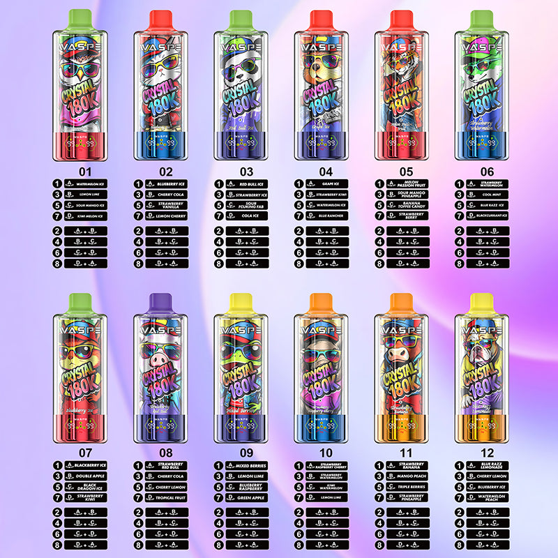 The WASPE Crystal 8 in 1 redefines endurance, delivering a monumental 180,000 puffs from a massive 68ml capacity. It’s a flavor innovator, offering 4 distinct tastes and 4 unique blends from their fusion. Powered by a quad 1.0Ω mesh coil system and a 650mAh battery with Type-C charging, it sets a new standard for power and variety.