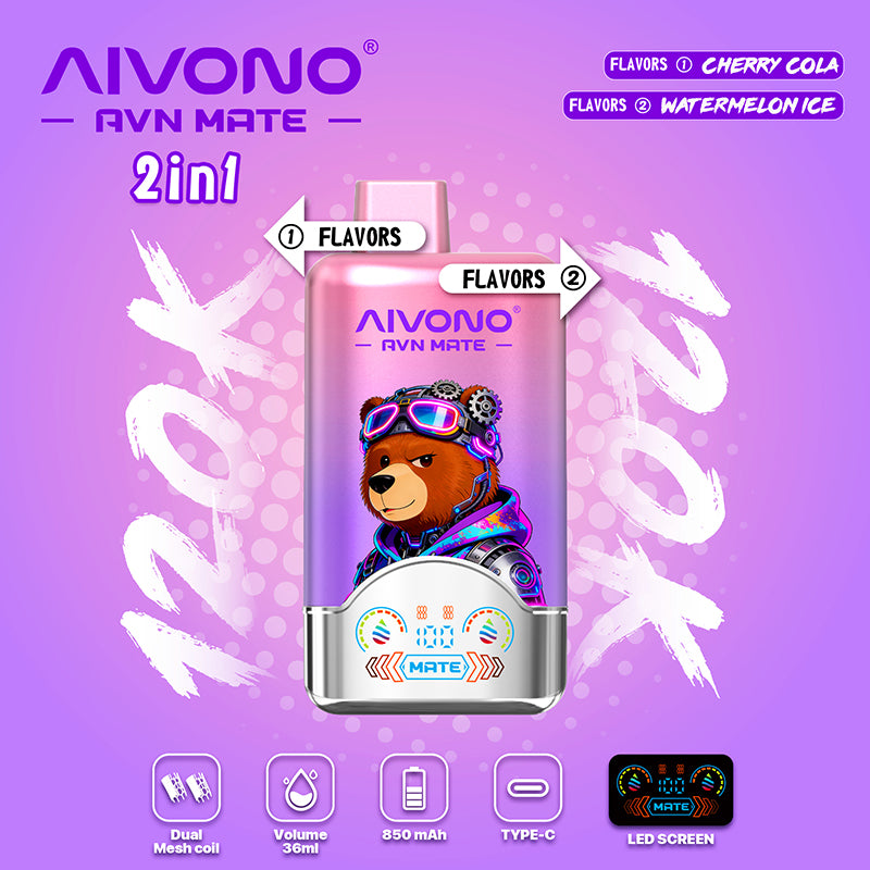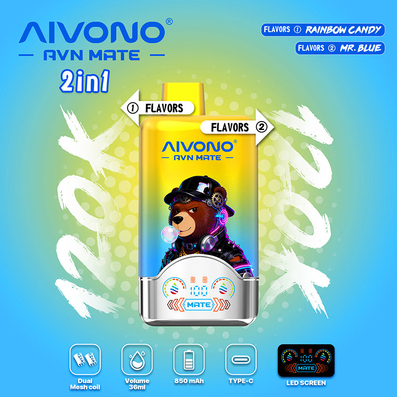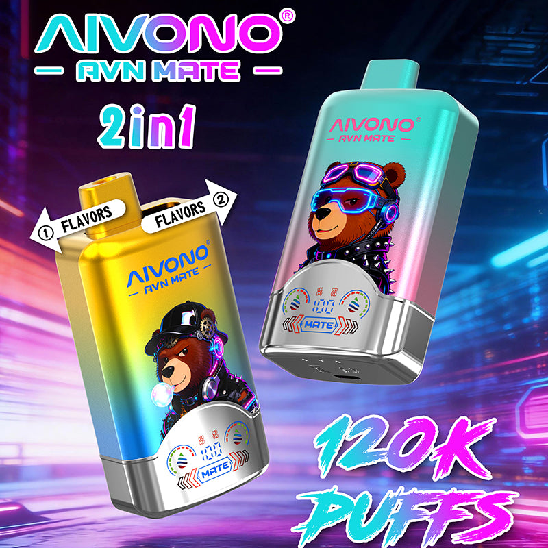 The AIVONO AVN MATE 2 IN 1 offers ultimate versatility with dual flavors in one device. Experience an impressive 120,000 puffs from its 36ml reservoir, powered by an 850mAh battery with Type-C charging. The smart LED display keeps you informed.